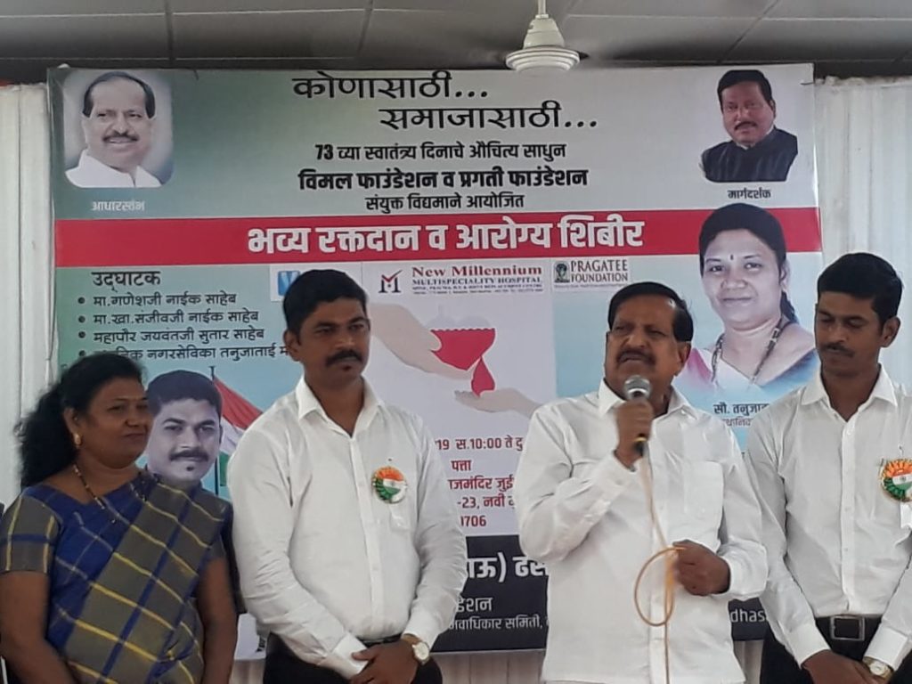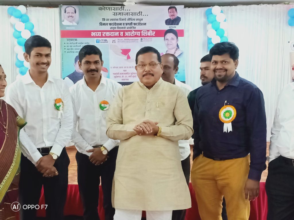 भारताच्या स्वातंत्र्याला 73 वर्षे पूर्ण झाल्याचे औचित्य साधून आरोग्य शिबिर आणि रक्तदान शिबिराचे आयोजन करण्यात आले होते. सदर शिबिराला आय. टी. एम. हेल्थ सायंस, न्यु मिलेनियम होस्पिटल, स्वराशी नेत्रालय, एम. जी. एम. डेंटल, डॉ. डी. वाय. पाटील आयुर्वेदिक हॉस्पिटल नवी मुंबई आणि अनविश्का ब्लड बँक यांचे सहकार्य लाभले.