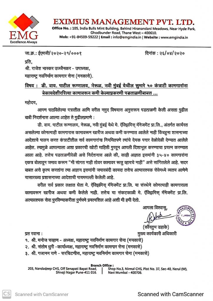 नेरूळच्या डी वाय पाटील रुग्णालयात एक्सिमिस प्रायवेट लिमिटेड या कंत्राट दाराचे कंत्राट असून त्यात सुमारे 220 कामगार काम करतात. रुग्णालयातील कंत्राट दाराच्या मुजोर पणाचा कळस म्हणजे 50 कामगारांना बेकायदेशीर कामावरून कमी केले होते.