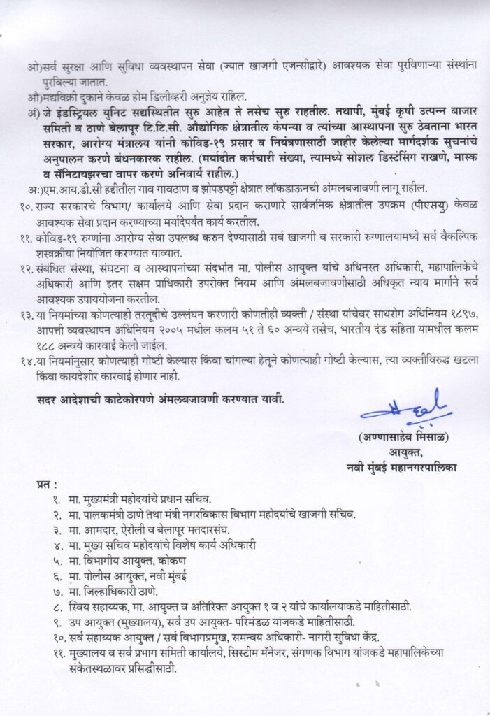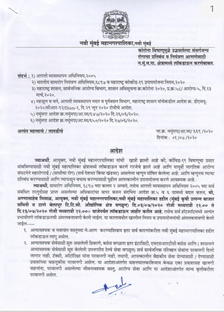 कोरॉनाचा वाढता प्रादुर्भाव पाहता नवी मुंबईत 3 जुलै मध्यरात्री पासून दिनांक 13 जुलै पर्यंत संपूर्ण लॉक डाऊन जाहीर करण्यात आला आहे. अत्यावश्यक सेवा वगळता बाकी सर्व व्यवहार बंद राहणार आहेत. वाशीतील ए पी एम सी मार्केट जीवनावश्यक वस्तूंचा पुरवठा सुरळीत राहण्यासाठी सुरू असणार आहे.