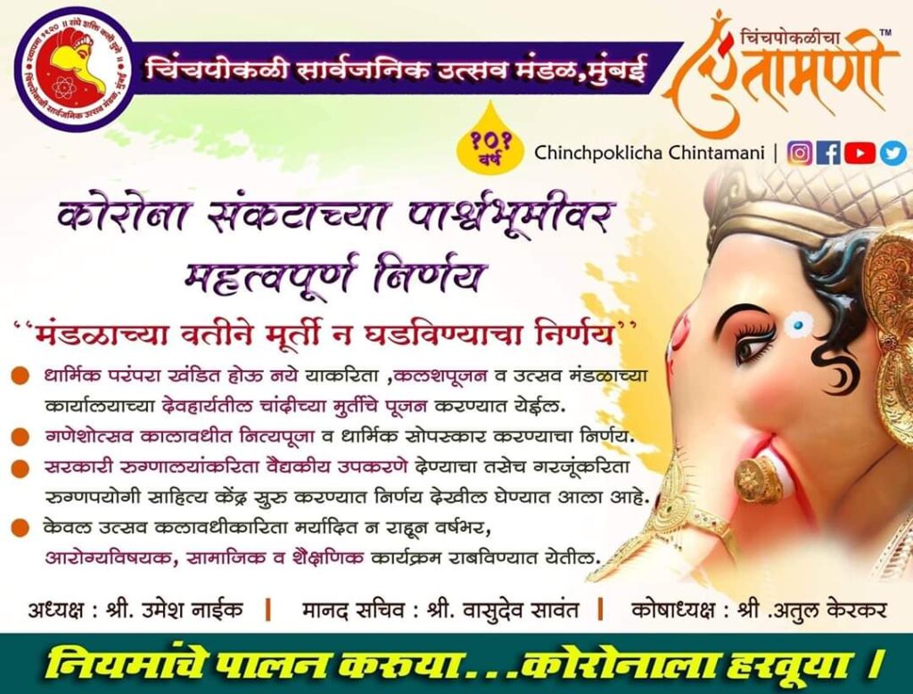 कोरोनाच्यात महामारित सर्व व्यवहार पूर्ण ठप्प झाले आहेत. अशावेळी आता श्रावण महिना सुरू होणार आहे. त्यात सर्वात मोठा सण म्हणजे गणेशोत्सव. लालाबाचा राजा हा मुंबईतील सर्वात मोठा सार्वजनिक गणपती. यंदा लालबागच्या राजाने मूर्ती न बसविता अरोग्योत्सव साजरा करण्याच ठरवलं. मुख्यमंत्री उद्धव ठाकरे यांनी सार्वजनिक गणेश उत्सव मंडळांना आवाहन केले होते की, सण सध्यापणाने साजरा करा आणि अधिकाधिक समाज उपयोगी कार्यक्रम राबवावेत. याला लालबागच्या राजाने सकारात्मक प्रतिसाद दिला. याचेच अनुकरण करीत आता मुंबईतील प्रसिद्ध चिंतामणी गणेश उत्सव मंडळाने सुद्धा मूर्ती न घडविता आरोग्य विषयक, सामाजिक व शैक्षणिक उपक्रम राबविण्याचा निर्णय घेतला आहे.