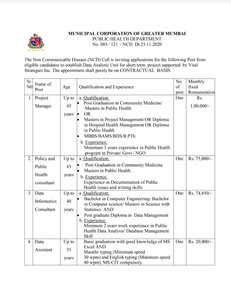 महानगरपालिका अंतर्गत संप्रेषित रोग (एनसीडी) सेल येथे प्रकल्प व्यवस्थापक, धोरण आणि सार्वजनिक आरोग्य सल्लागार, डेटा माहिती विज्ञान सल्लागार, डेटा सहाय्यक पदांच्या एकूण 4 रिक्त जागा भरण्यासाठी पदांनुसार पात्र असणाऱ्या उमेदवारांकडून अर्ज मागविण्यात येत आहे. नोकरी ठिकाण मुंबई आहे. अर्ज ऑफलाईन पद्धतीने करायचा आहे. लक्षात ठेवा, अर्ज करण्याची शेवटची तारीख 4 डिसेंबर 2020 आहे.