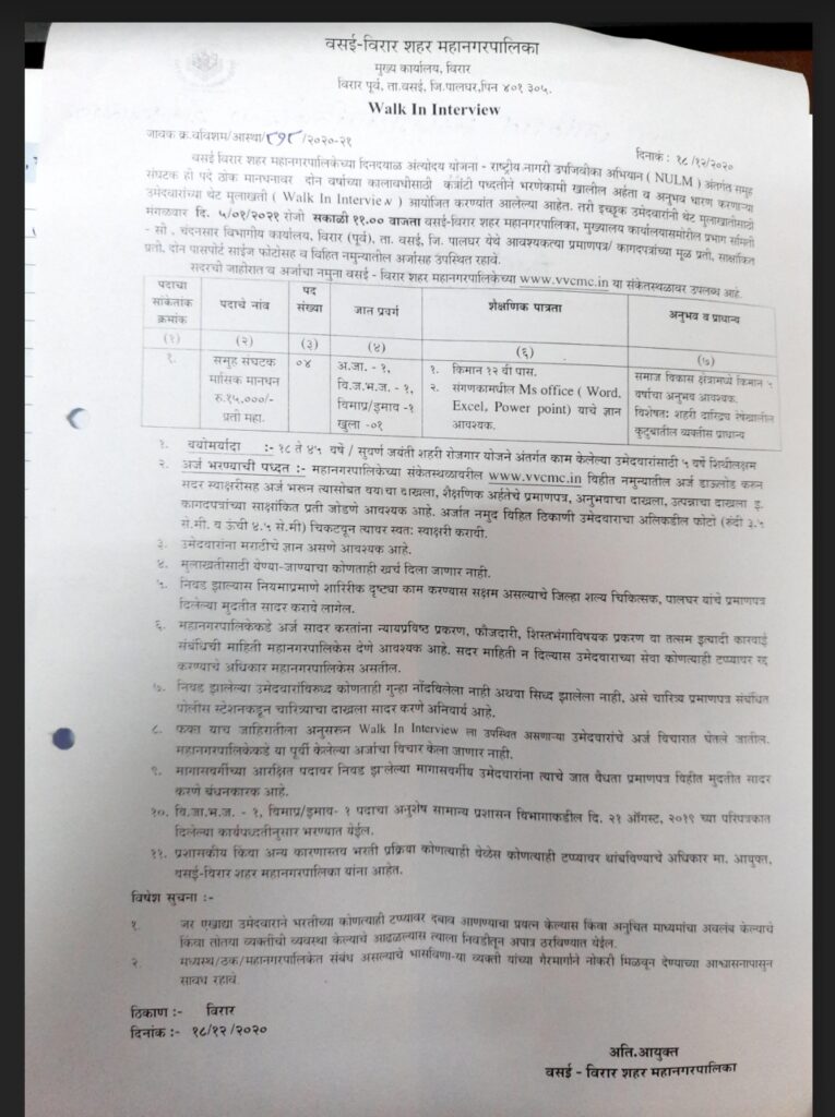 - मुलाखतीचा पत्ता : वसई विरार शहर महानगरपालिका, मुख्यालय कार्यालयासमोरील प्रभाग समिती – सी, चंदनसार विभागीय कार्यालय, विरार (पूर्व), ता. वसई, जि. पालघर