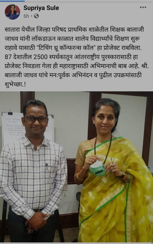 कोरोना काळात इंटरनेट किंवा नेटवर्क पुरेसा नसताना ऑडिओ कॉन्फरन्सच्या माध्यमातून विद्यार्थ्यांचा फोनवरून अभ्यास पूर्ण करून एक नाविन्यपूर्ण उपक्रम बालाजी जाधव यांनी राबविला आणि त्यांच्या या नाविन्यपूर्ण प्रोजेक्टसाठी त्यांना आंतरराष्ट्रीय पुरस्कार प्राप्त झाला आहे. बालाजी जाधव यांना HBN Creativities and exclusive हा आंतरराष्ट्रीय पुरस्कार प्राप्त झाला आहे ही बाब महाराष्ट्रासाठी अत्यंत अभिमानास्पद आहे. आणि म्हणुनच राज्याचे शिक्षणमंत्री वर्षा गायकवाड यांनी बालाजी जाधव यांचा विशेष गौरव केला. त्यांना शुभेच्छा पत्र, श्रीफळ व पुष्पगुच्छ देऊन त्यांचा विशेष सन्मान करण्यात आला. याप्रसंगी माजी खासदार एकनाथ गायकवाड, मुंबई कॉंग्रेस रोजगार व स्वयंरोजगार विभागाचे अध्यक्ष जयवंत लोखंडे आणि प्रगती फाऊंडेशन या सामाजिक संस्थेचे अध्यक्ष किरण राणे उपस्थित होते. याप्रसंगी बालाजी जाधव यांना प्रगती फाऊंडेशन या संस्थेमार्फत CERTIFICATE OF EXCELLENCE IN EDUCATION हे प्रमाण पत्र देवून गौरविण्यात आले तसेच बालाजी जाधव यांची संस्थेच्या ग्रामीण शिक्षण विकास सल्लागार म्हणून नियुक्ती करण्यात आली.