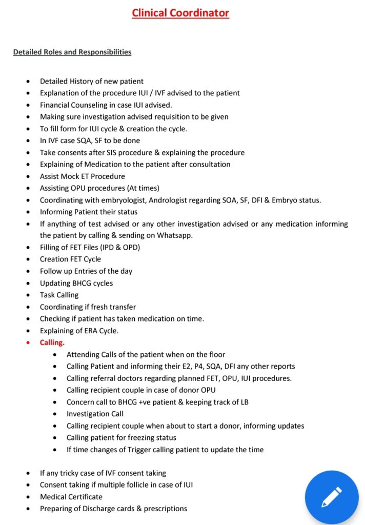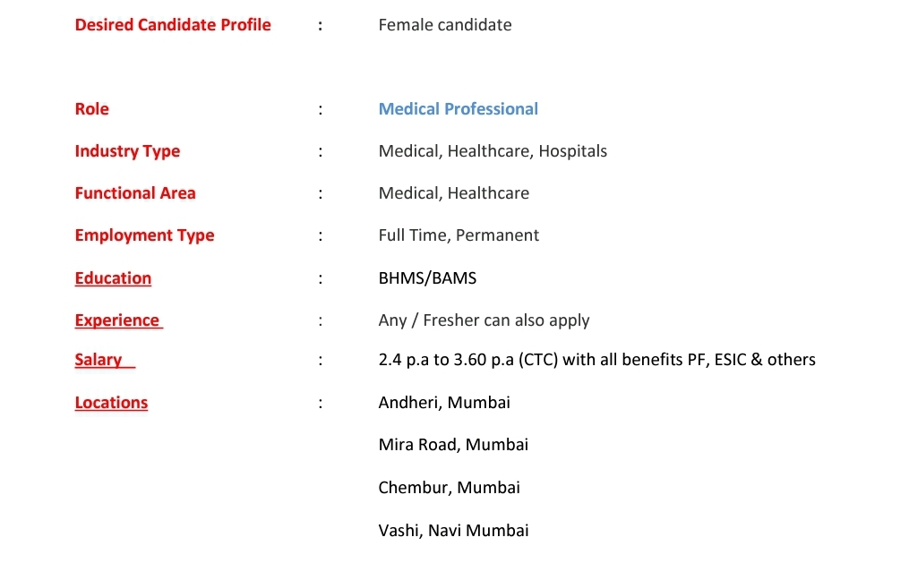 In Major City, a professional HR Consulting firm is seeking candidates for the position of “Medical Professional” (4 positions) for a very reputed and chain of IVF – Clinics across Mumbai, Thane & Navi Mumbai locations.