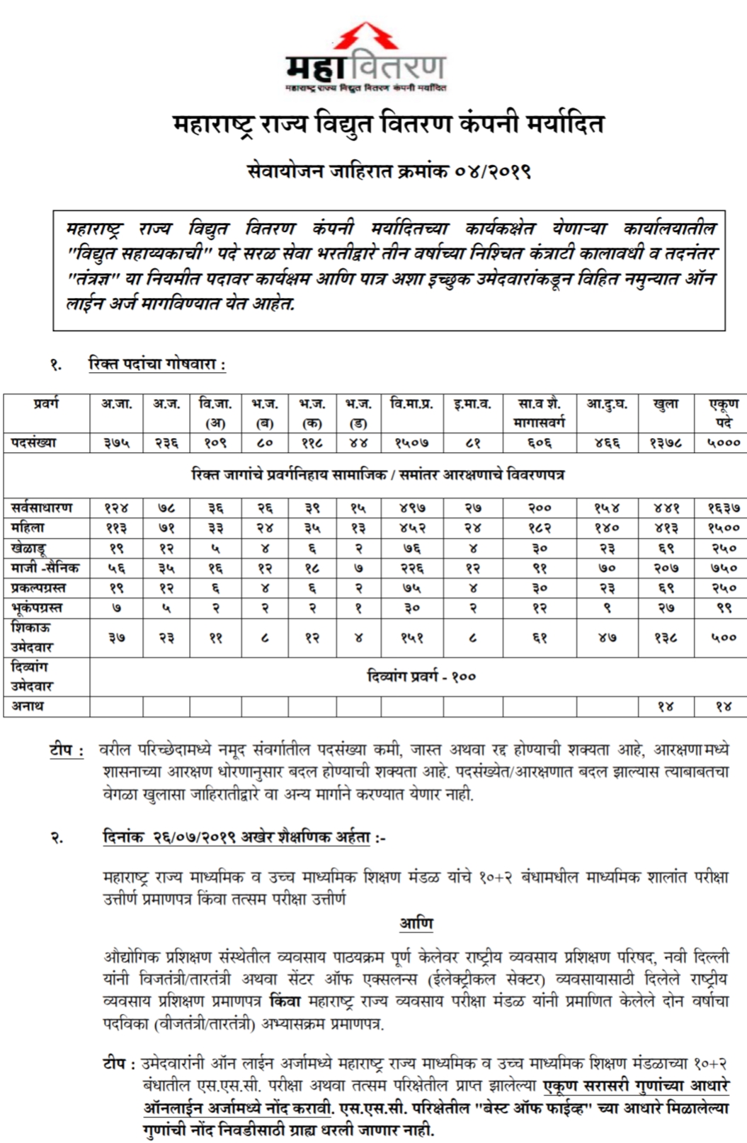 एकूण पाच हजार पदे असून बारावी उत्तीर्ण व इलेक्टरेसिण (वायरमन) कोर्स केलेला असावा. इच्छुक उमेदवारांनी ऑनलाईन पद्धतीने अर्ज भरायचा असून याबाबतची अधिक माहिती वेबसाईटवर उपलब्ध करण्यात आली आहे.